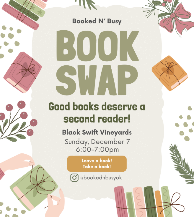 VIEW MAPGood books deserve a second reader! Join us at Black Swift Vineyards for our December book club, with a book swap! Bring some books you no longer need, and take some home to add to your TBR list. There will be wine available for purchase, and general discussion questions on the tables. RSVP on Instagram @bookednbusyok – everyone welcome!